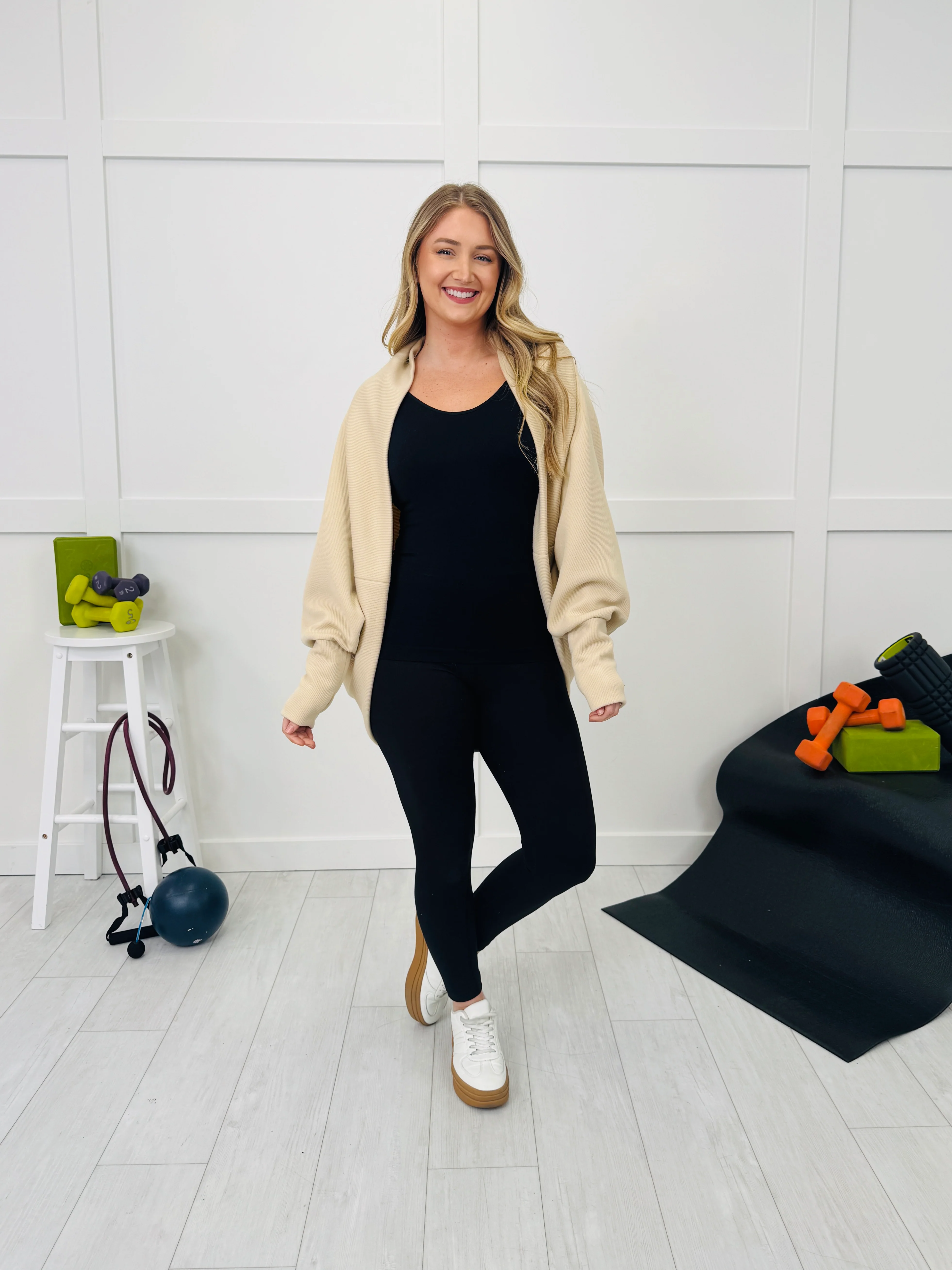 Stay warm and stylish with this chic cocoon-style cardigan! Featuring classic dolman sleeves and soft, stretchy fabric, this versatile piece is ready for any season! It also includes subtle thumb holes and comes in two neutral colors.