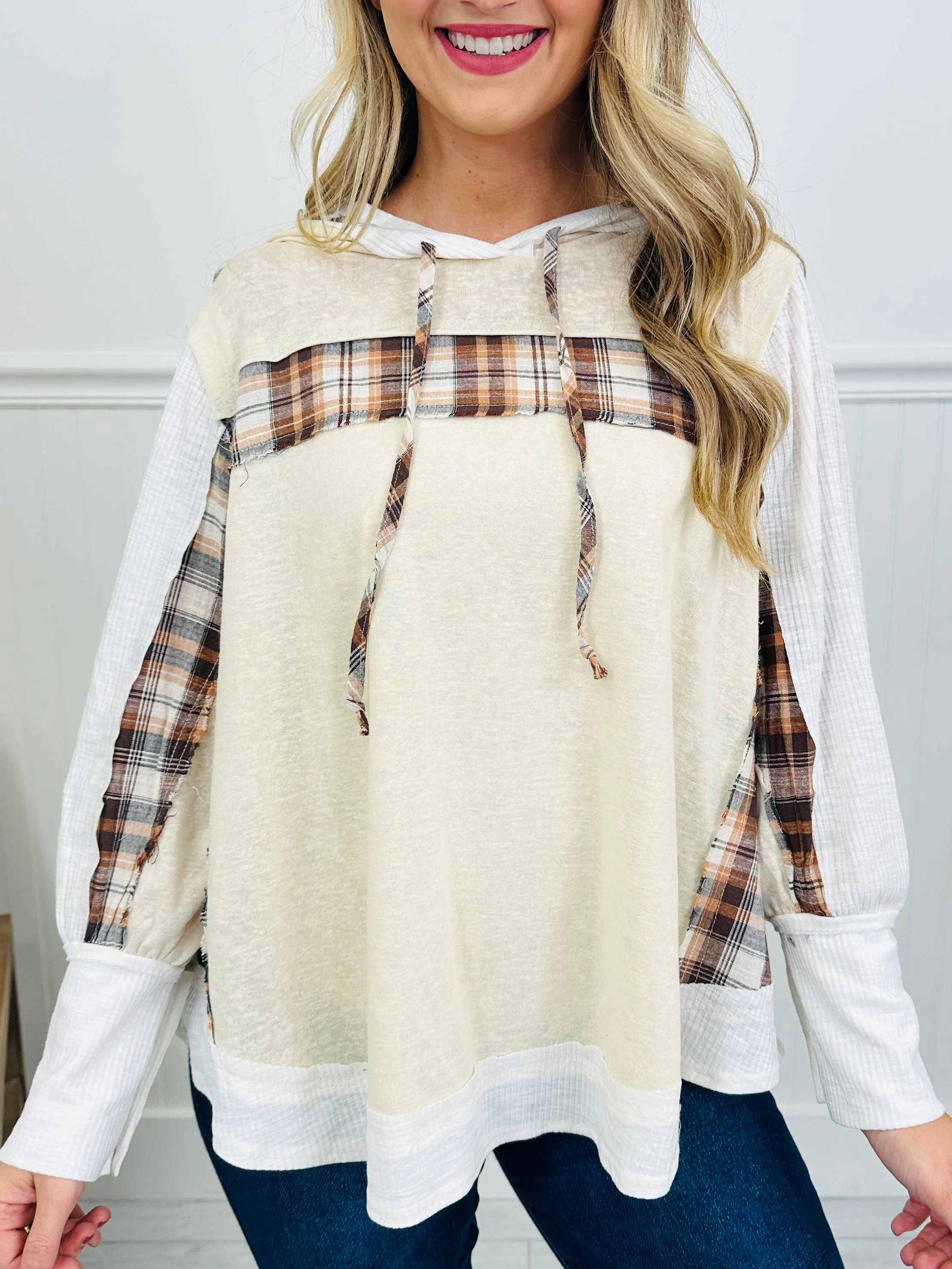 This top blends cozy and cool with its mix of textures and patterns. The textured sleeve detail adds dimension, while the plaid patch accents give it that perfectly lived-in look. Complete with a casual hooded fit, it’s an easy choice for relaxed days when you still want to look effortlessly put together.