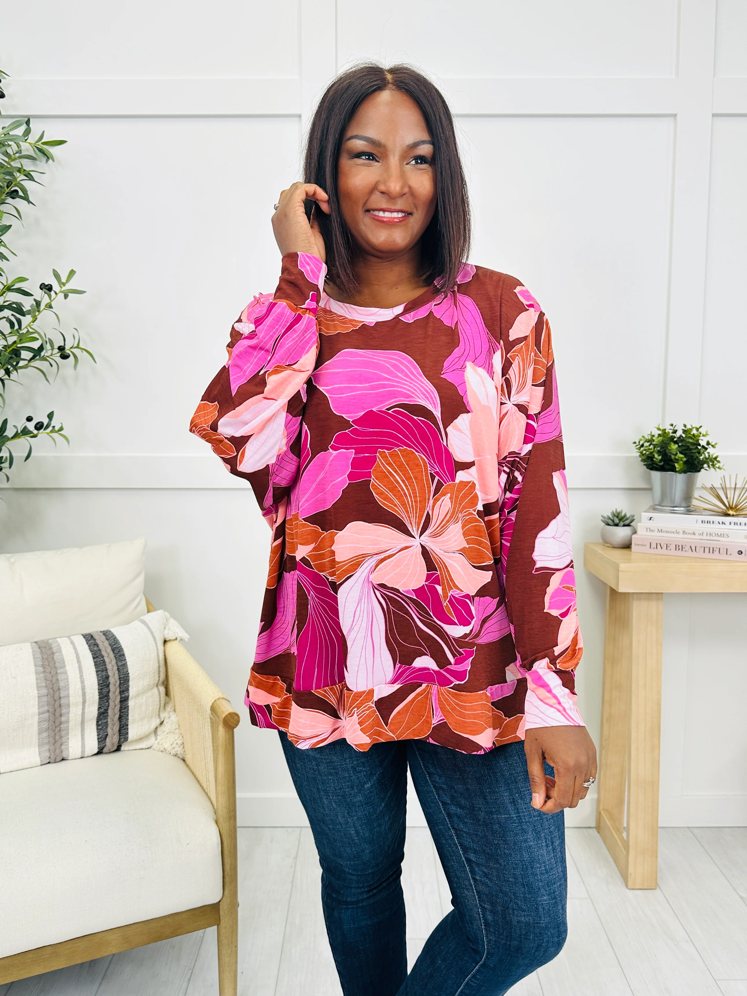 Bring a burst of color to your wardrobe with this vibrant floral top. Featuring bold pink, orange, and magenta blooms over a rich brown background, it makes a statement while keeping things effortlessly chic. The relaxed draped fit and flowy long sleeves create a comfortable, easy-to-wear silhouette that pairs beautifully with jeans or dressy bottoms alike.