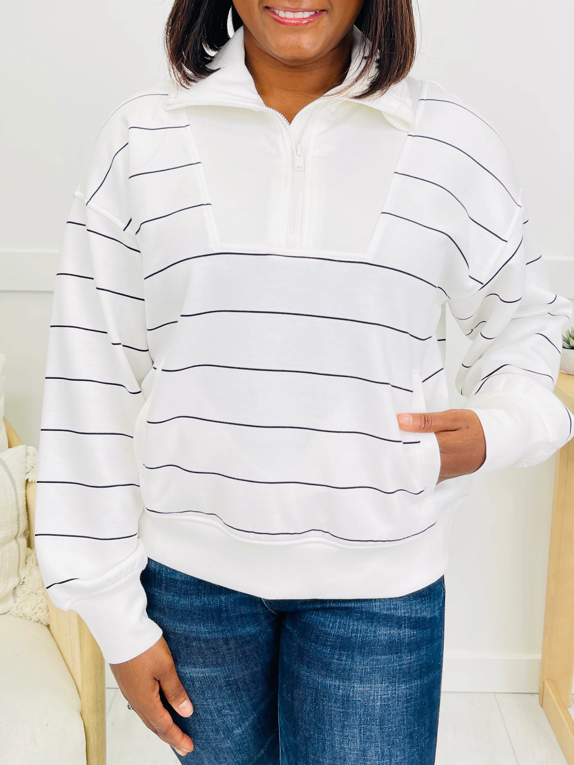 Meet your new grab-and-go layer: a relaxed pullover with a half-zip collar you can wear zipped or open. The thin stripes keep it classic while the kangaroo pocket and banded edges pull everything together. Easy to toss on with denim for an instant, off-duty vibe