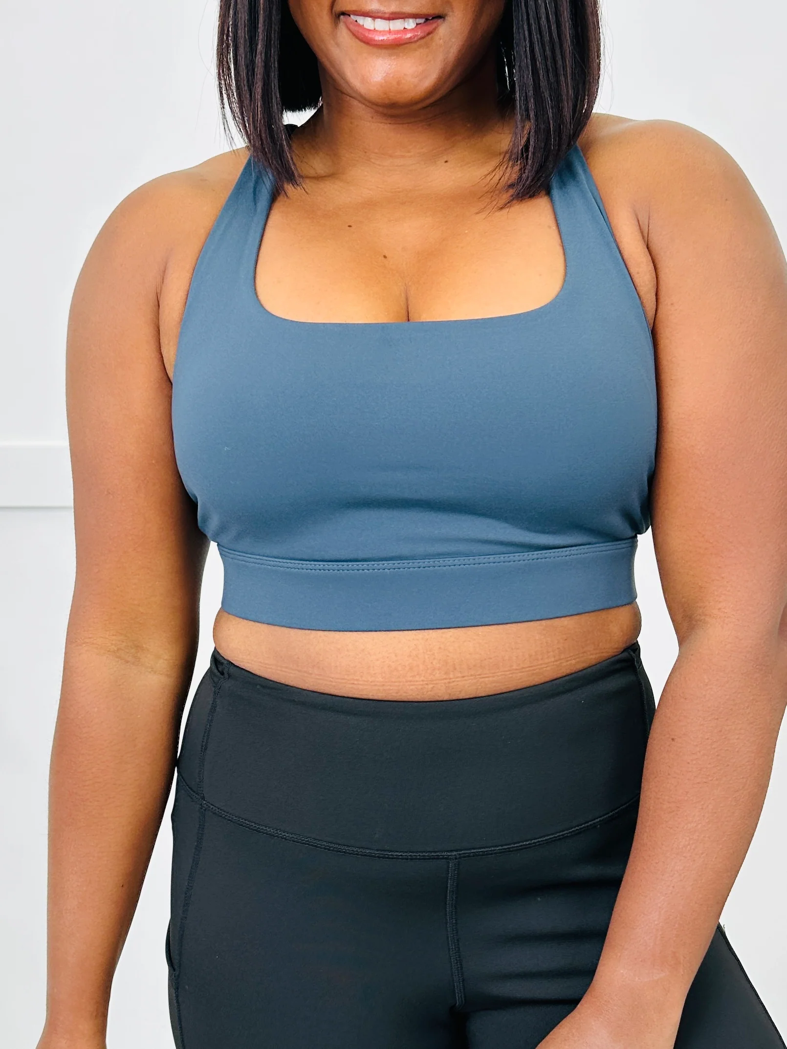 This sports bra brings a clean, smooth look in front while the back shows off eye-catching criss-cross strapping that adds a stylish twist. The streamlined fit creates an athletic, modern feel and the wide bottom band appears supportive and comfortable for movement. A standout piece for workouts or active days, it offers a sleek silhouette from every angle.