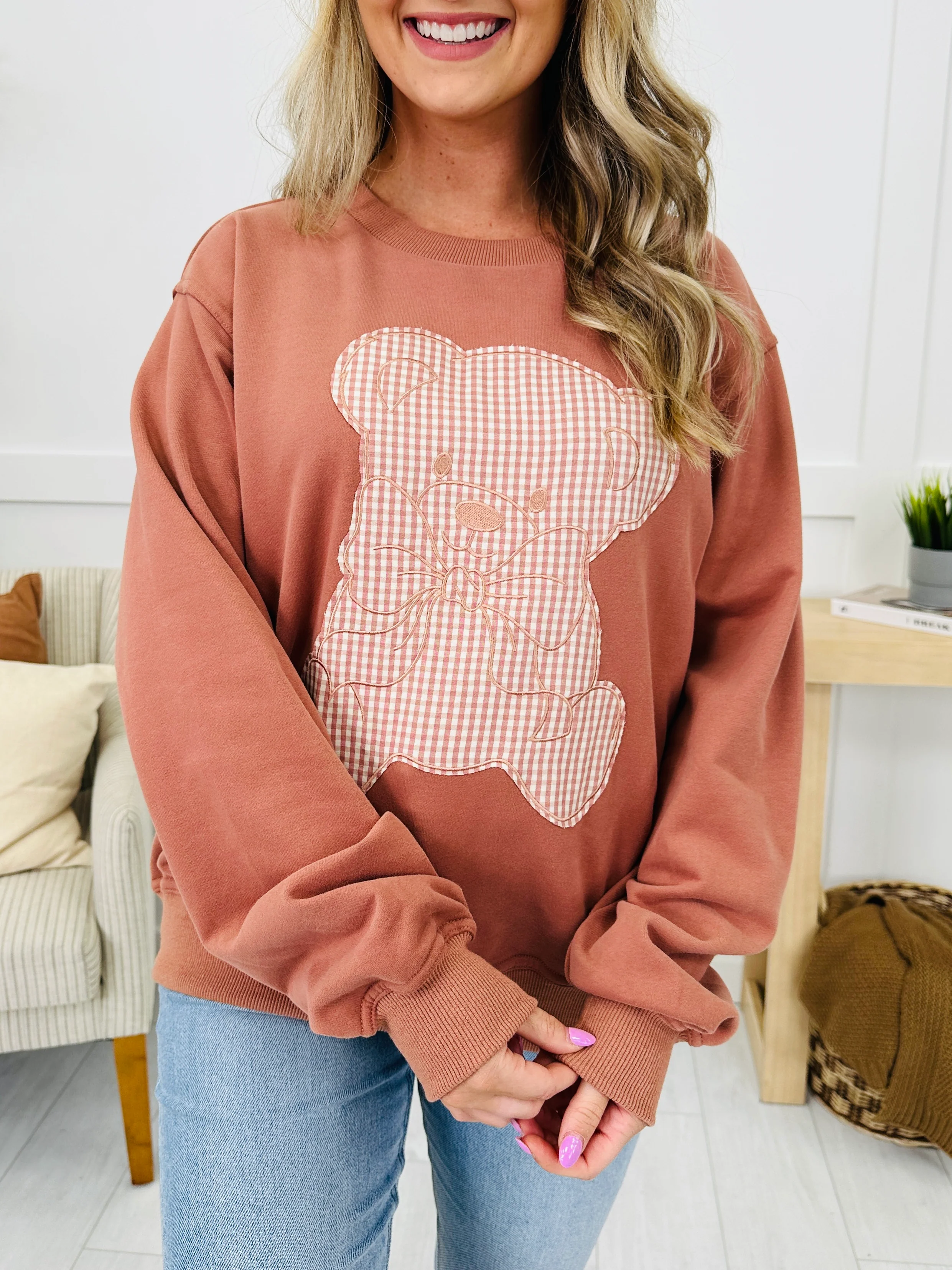 Sweet and playful, this sweatshirt is a must-have for casual days. The gingham teddy appliqué adds a darling, nostalgic touch, while the ribbed cuffs and hem keep the fit comfy and secure. With its cozy relaxed fit, it’s perfect for pairing with jeans or leggings for an effortlessly cute look.