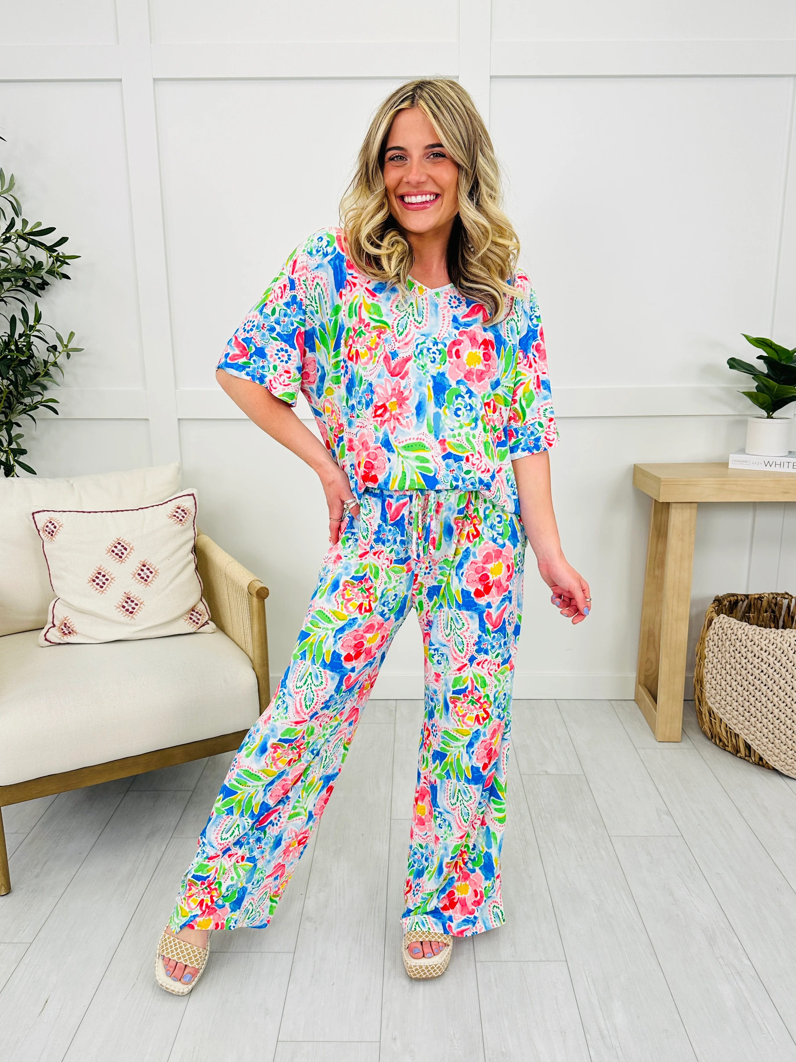 This printed set is the perfect set to wear when it's warm outside. This cool to the touch, dreamy material feels so amazing and it is 100% wrinkle free, so you can get up and go! The elastic waist-band and functional drawstring give you the perfect fit!
