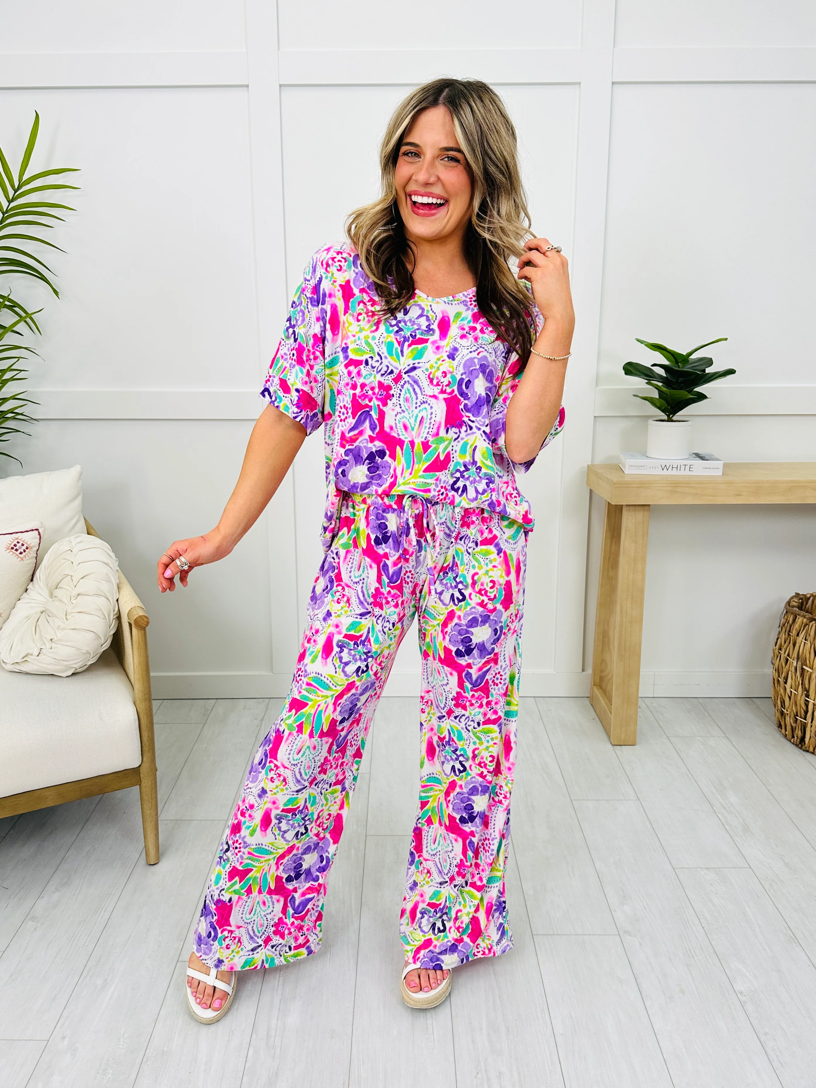This printed set is the perfect set to wear when it's warm outside. This cool to the touch, dreamy material feels so amazing and it is 100% wrinkle free, so you can get up and go! The elastic waist-band and functional drawstring give you the perfect fit!